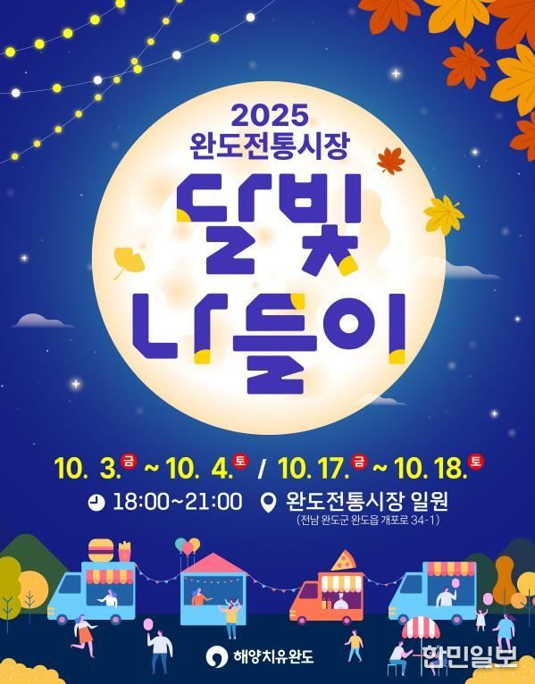 한민일보 서울포커스 박용남 기자 | 완도군은 10월 첫째, 셋째 주 금·토요일 오후 6시부터 9시까지 총 4회에 걸쳐 완도전통시장에서 ‘달빛 나들이’ 행사를 개최한다.