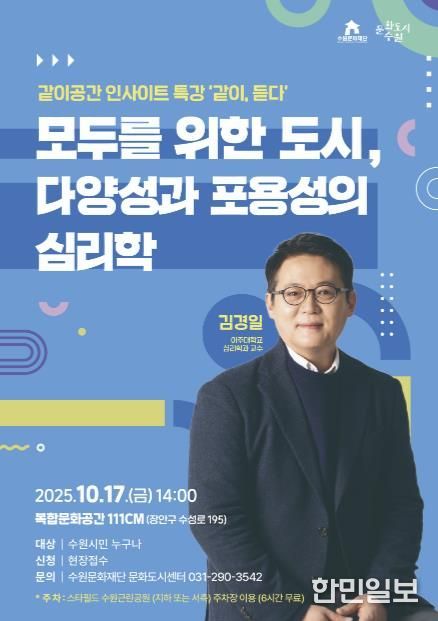 수원문화재단 관계자는 “이번 프로그램이 문화도시 수원의 비전인 ‘서로를 살피고 문제에 맞서는 도시’를 실현하는 의미 있는 실천의 장이 되기를 바란다.”며, “특강으로는 우리 사회의 지향점을 고민해 보고, 부모집단상담으로는 양육의 어려움을 나누며 실질적 해법을 얻는 기회가 되기를 기대한다.”고 말했다.