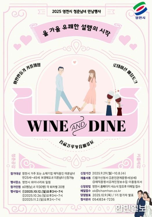 한민일보 서울포커스 김봉순 기자 | 영천시는 오는 10월 12일, 10월 26일, 11월 2일 세 차례에 걸쳐 관내 와이너리에서 미혼남녀를 위한 특별한 만남 프로그램 ‘2025 영천愛 와인·다인(wine·dine)’을 개최한다.