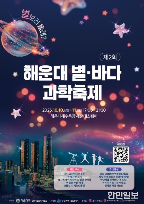 한민일보 서울포커스 임광현 기자 | 해운대구는 부산과학기술협의회와 함께 10월 10일과 11일 오후 5시부터 9시 30분까지 해운대해수욕장 해운대스퀘어에서 ‘제2회 해운대 별, 바다 과학축제’를 연다.