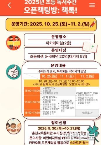 한민일보 서울포커스 곽중희 기자 | 춘천교육문화관은 책 읽기 좋은 계절인 가을을 맞아 오는 10월 25일, 10월 28일부터 11월 2일까지 초등학생 5~6학년 학생 20명을 대상으로 초등 독서주간 ‘오픈책팅방 책톡!’을 운영한다.