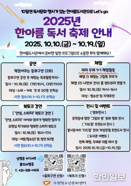 한민일보 서울포커스 진광성 기자 | 수원시청소년청년재단 수원청소년문화센터 한아름도서관은 2025. 독서의 달을 기념하여‘한아름독서축제’를 10월 10일부터 10월 19일까지 운영한다.