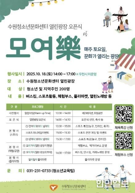 한민일보 서울포커스 진광성 기자 | 수원시청소년청년재단 청소년문화센터는 오는 10월 18일 청소년문화센터 야외광장에서'열린광장 오픈식‘모여락(樂')을 개최한다.