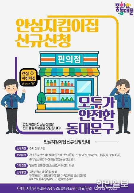 한민일보 서울포커스 임광현 기자 | 서울 동대문구는 여성·아동 등 범죄취약계층을 보호하기 위해 안심지킴이집 신규 지정 확대 사업을 추진한다고 밝혔다.
