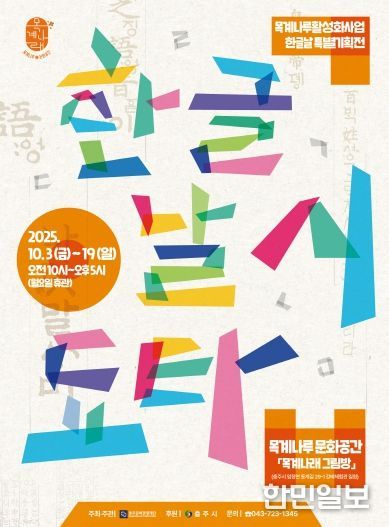 한민일보 서울포커스 김다남 기자 | 충주문화관광재단은 오는 10월 3일, 목계나루문화공간(강배체험관) 일원에서 시민과 함께하는 특별 기획전'한글날시됴타'를 개최한다고 밝혔다.