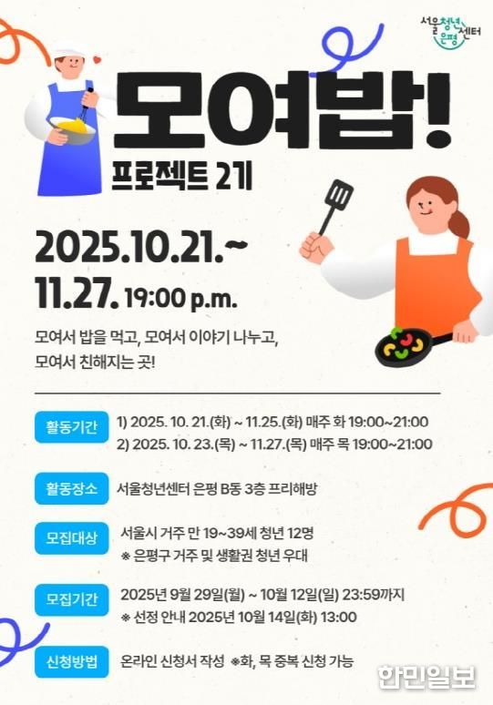 한민일보 서울포커스 임광현 기자 | 서울 은평구는 서울청년센터 은평이 요리와 봉사를 결합한 청년 커뮤니티 프로그램 ‘모여밥’의 2기 참여 청년을 오는 12일까지 모집한다고 밝혔다.