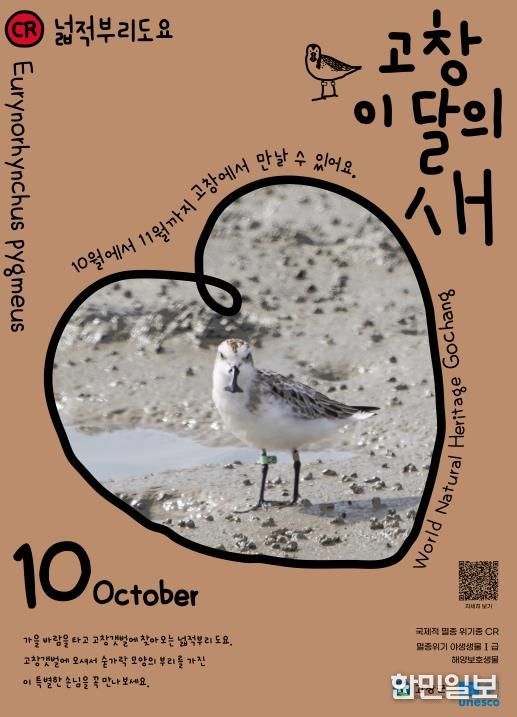 한민일보 서울포커스 박용남 기자 | 고창군이 10월 ‘고창갯벌 이달의 새’로 멸종위기 철새인 넓적부리도요(학명 Calidris pygmaea)를 선정하고, 세계적으로 희귀한 철새 보호의 필요성을 알리기 위한 캠페인을 이어간다.