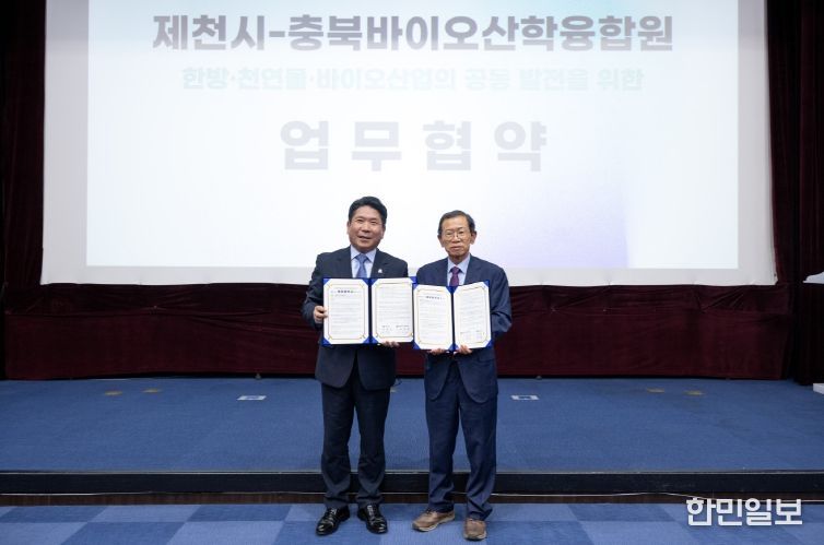 한민일보 서울포커스 김다남 기자 | 제천시는 9월 30일 ‘2025 제천국제한방천연물산업엑스포’ 기간 중 한방생명과학관 다목적강당에서 충북바이오산학융합원과 한방·천연물산업 발전을 위한 업무협약(MOU)을 체결했다.