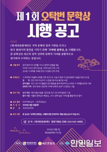한민일보 서울포커스 김다남 기자 | (재)제천문화재단(이사장 김상수)은 지역 문학의 창작 기반을 다지고 한국 현대시의 발전을 기리기 위해 제천문화재단 제1회'오탁번 문학상'을 공고했다. 이번 문학상은 최근의 창작 성과와 문학적 기여를 종합적으로 평가하여 수여하는 상으로, 오탁번 시인의 문학 정신을 기리고 문학적 전통을 계승하는데 그 취지가 있다.