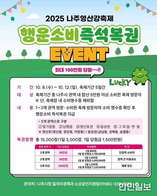 한민일보 서울포커스 임광현 기자 | 전라남도 나주시가 ‘2025 나주영산강축제’를 찾는 시민과 관광객들에게 특별한 즐거움과 함께 지역 상권 활력을 불어넣기 위해 ‘행운 소비 즉석 복권 이벤트’를 진행한다.