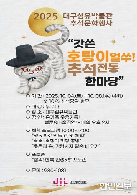 한민일보 서울포커스 김봉순 기자 | 대구섬유박물관은 10월 4일부터 10월 8일까지(추석 당일 휴관) 추석 문화행사 ‘갓 쓴 호랑이랑 얼쑤!‘를 개최한다.