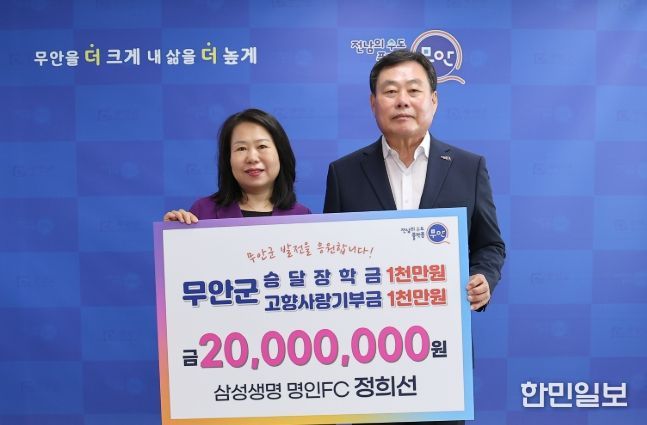한민일보 서울포커스 박용남 기자 | 전남 무안군은 1일 삼성생명 정희선 명인FC가 지역 인재 양성과 지역 발전을 위해 소중히 써달라며 승달장학금 및 고향사랑기부금 각 1천만 원, 총 2천만 원을 기탁했다고 밝혔다.