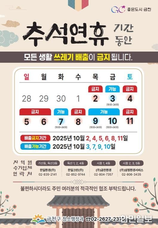 한민일보 서울포커스 곽중희 기자 | 금천구는 추석 연휴 기간 생활쓰레기(일반생활쓰레기, 음식물쓰레기, 재활용품) 수거를 일시 중단한다고 밝혔다.