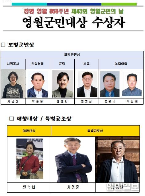 영월군민대상은 군민 화합과 지역 발전을 위해 분야별로 헌신한 군민을 대상으로 8월 18일부터 9월 12일까지 부문별 추천을 받아, 9월 19일 사전심사를 거쳐 9월 30일 '영월군민대상 심사위원회'를 통해 최종 9명을 확정했다.