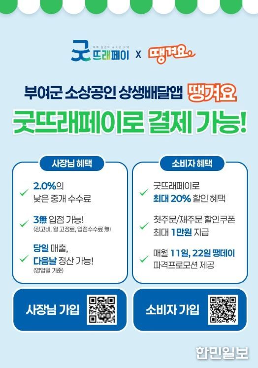 한민일보 서울포커스 유돈상 기자 | 부여군은 9월 30일부터 공공배달앱 ‘땡겨요’에서 굿뜨래페이 결제서비스를 시작한다고 밝혔다.