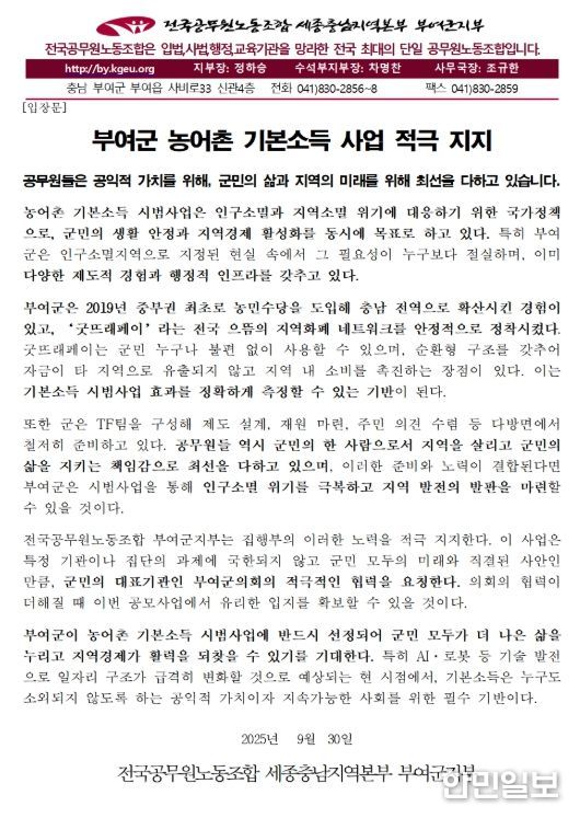 한민일보 서울포커스 유돈상 기자 | 전국공무원노동조합 부여군지부는 지난 9월 30일 의견문을 통해, 부여군이 추진 중인 농어촌 기본소득 시범 사업을 적극적으로 지지하며, 군민과 함께 공모사업 유치에 최선을 다하겠다는 뜻을 밝혔다.