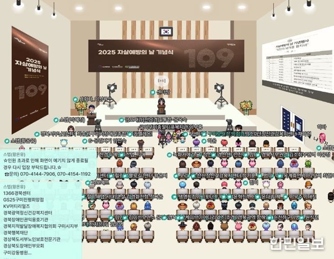한민일보 서울포커스 김봉순 기자 | 구미시는 정신건강과 자살예방의 중요성을 알리기 위해 지난 1일 메타버스 플랫폼(ZEP) ‘구미정신건강월드’에서 '제13회 자살예방의 날 기념행사-희망의 날개를 펼치며'를 개최했다.
