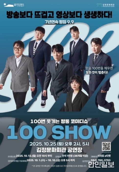 한민일보 서울포커스 김다남 기자 | 서귀포시는 2025년 연극특성화사업의 마지막 공연으로, 전통적인 연극의 틀을 깨고 관객과 실시간으로 소통하는 신개념 코미디 연극 '100 SHOW'를 오는 10월 25일 오후 2시와 5시, 총 2회에 걸쳐 김정문화회관 공연장에서 선보인다.