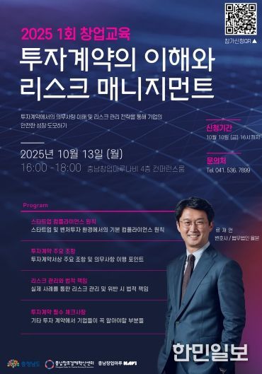 교육은 2025년 10월 13일 충남창업마루나비에서 진행되며, 류재언 변호사(법무법인 율본)가 강사로 참여해 스타트업 컴플라이언스 원칙, 투자계약 주요 조항, 리스크 관리 및 법적 책임, 투자계약 필수 체크사항 등을 상세히 강의할 예정이다.