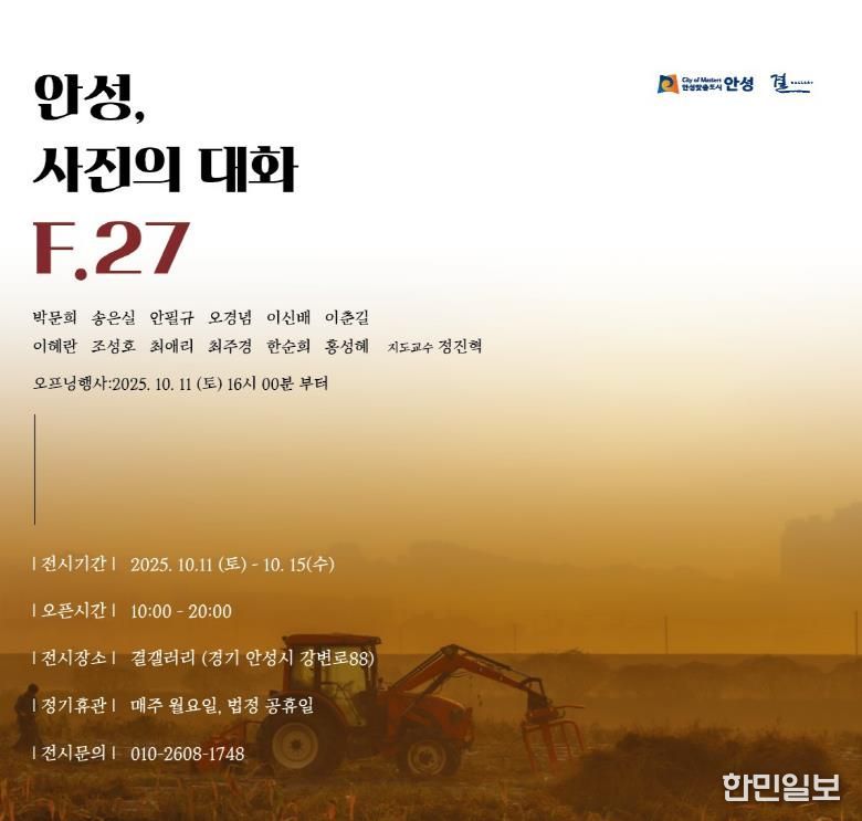 한민일보 서울포커스 임경복 기자 | 안성시 사진동아리 F.27 photo가 오는 10월 11일부터 15일까지 안성천 작은미술관 결갤러리에서 전시회 ‘안성, 사진의 대화 F.27’을 개최한다. 이번 전시는 동아리 회원 18명이 참여해 안성의 자연환경과 사람들의 이야기를 기록한 작품을 선보인다.