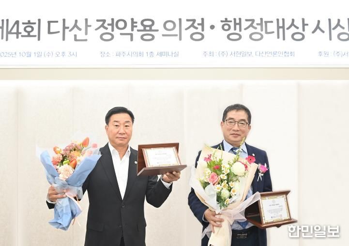 한민일보 서울포커스 진광성 기자 | 파주시의회 박대성 의장, 손형배 의원은 10월 1일 파주시의회에서 열린 제4회 다산 정약용 의정·행정대상에 기초의원 부문 대상을 수상했다. 또한 파주를 지역구로 둔 경기도의회 이한국 도의원도 광역의원 부문에 함께 수상되어 의미를 더했다.