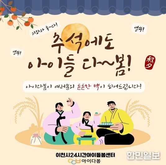 한민일보 서울포커스 박용남 기자 | 이천시는 추석 연휴 기간에도 이천시 24시간 아이돌봄센터인 ‘아이다봄’을 365일 24시간 정상 운영해 연휴 중 발생할 수 있는 돌봄 공백을 최소화한다고 밝혔다.