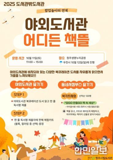 한민일보 서울포커스 김다남 기자 | 청주시립도서관은 오는 11일 오전 11시부터 오후 3시까지 생명누리공원 일원에서 2025년 팝업놀이터와 연계해 ‘도서관밖도서관’을 운영한다.