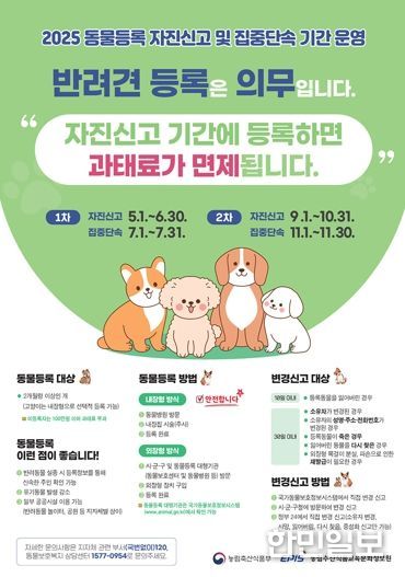 한민일보 서울포커스 곽동근 기자 | 양천구는 반려동물의 유실·유기 방지와 체계적인 관리 강화를 위해 오는 10월 31일까지 ‘동물등록 자진신고 기간’을 운영한다고 9일 밝혔다.