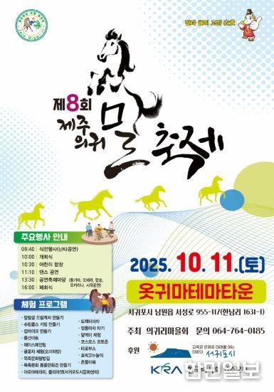 한민일보 서울포커스 김다남 기자 | 서귀포시는 ‘헌마공신 김만일’을 기리고, 제주 전통마와 지역 목축문화를 널리 알리기 위한 제8회 의귀말 축제가 오는 11일 옷귀마테마타운 일원에서 개최된다고 밝혔다.