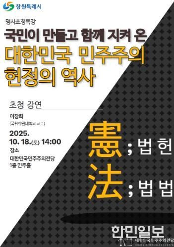 한민일보 서울포커스 김서윤 기자 | 창원특례시는 오는 10월 18일 오후 2시, 대한민국민주주의전당 민주홀에서 ‘대한민국 민주주의 헌정의 역사’ 특별 강연을 개최한다고 밝혔다.