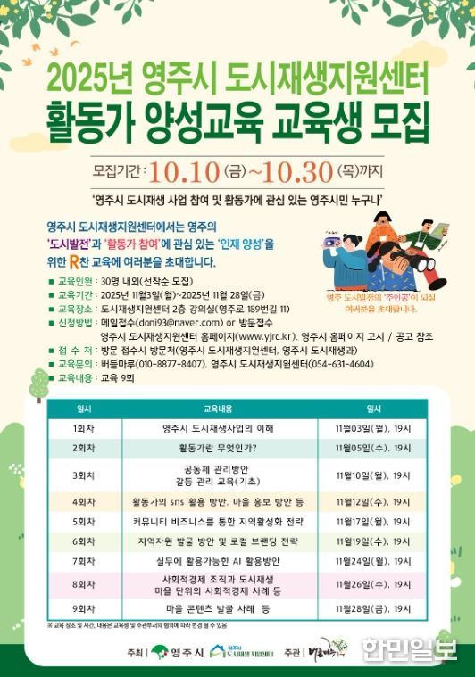 한민일보 서울포커스 김봉순 기자 | 영주시 도시재생지원센터는 영주시 도시재생사업에 관심 있는 시민을 대상으로 ‘2025년 활동가 양성과정 교육’ 수강생을 10월 10일부터 30일까지 모집한다.