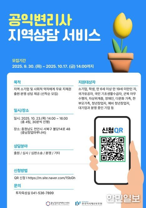 한민일보 서울포커스 박덕환 기자 | (재)충남창조경제혁신센터는 오는 10월 23일 오후 2시~4시, 충남 천안시 불당동 소재 창업지원공간 충남창업마루나비에서 공익변리사 무료 상담 서비스를 운영한다고 밝혔다.