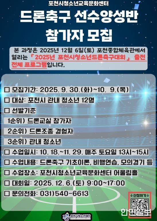 한민일보 서울포커스 심기옥 기자 | 포천시청소년재단 포천시청소년교육문화센터는 오는 10월 18일부터 11월 29일까지 매주 토요일, ‘드론축구 선수양성반’을 운영한다.