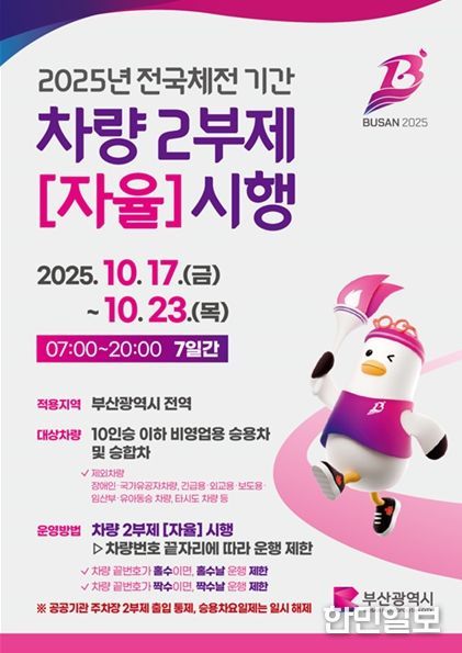한민일보 서울포커스 임광현 기자 | 부산시는 제106회 전국체전 기간을 맞아, 내일(14일) 오전 8시부터 서면교차로에서 교통공사, 버스조합 등 120여 명과 함께 '전국체전 기간 차량 2부제(자율) 참여와 대중교통 이용 홍보'를 위한 거리 캠페인을 펼친다고 밝혔다.