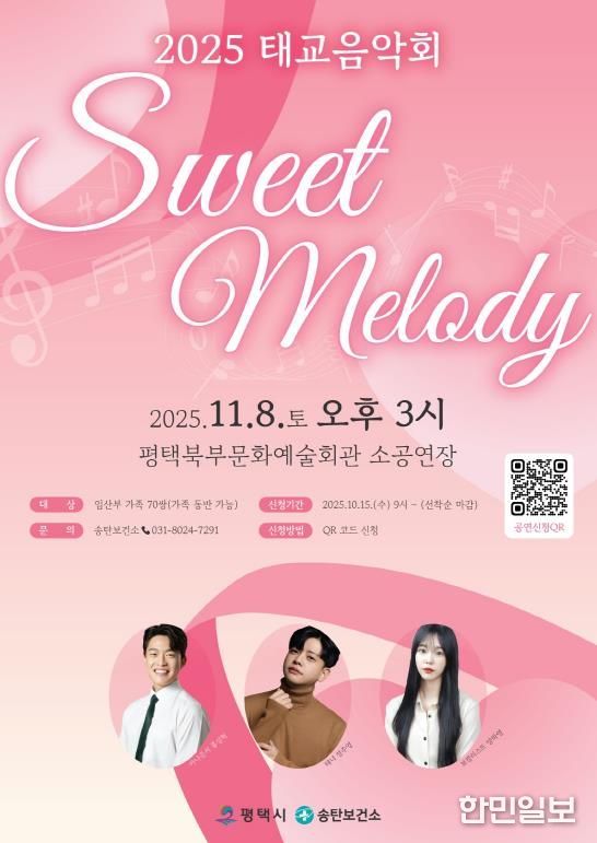 한민일보 서울포커스 황준형 기자 | 평택시 송탄보건소는 임산부 가족의 정서적 안정과 행복한 출산 환경조성을 위해 오는 11월 8일 ‘2025 태교 음악회『Sweet Melody』’를 개최한다.