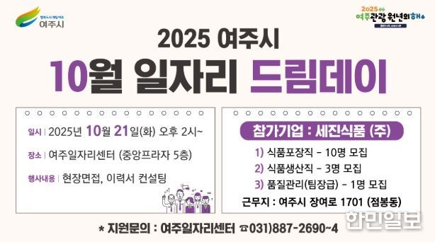 한민일보 서울포커스 전희주 기자 | 여주시는 오는 10월 21일 오후 2시 여주일자리센터(세종로 14번길 18, 중앙프라자 5층)에서 ‘2025년 10월 일자리드림데이’를 연다.
