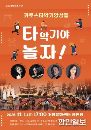 한민일보 서울포커스 김서윤 기자 | (재)거창문화재단은 오는 11월 1일 토요일 오후 5시 거창문화센터 공연장에서 카로스 타악기 앙상블과 함께하는'타악기야 놀자!'를 개최한다.