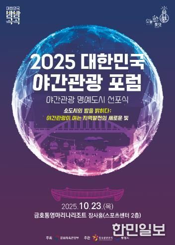 한민일보 서울포커스 김서윤 기자 | 통영시는 오는 23일 통영 금호마리나리조트에서 문화체육관광부가 주최하고 한국관광공사와 통영시가 공동으로 주관하는 '2025 대한민국 야간관광 포럼 및 야간관광 명예도시 선포식'을 개최한다.