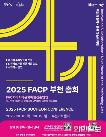 한민일보 서울포커스 김윤이 기자 | (재)부천아트센터가 주최하고, (재)부천아트센터·아시아문화진흥연맹(FACP)·(사)한국공연예술경영협회가 공동 주관하는‘제41회 2025 FACP 부천 총회(Federation for Asian Cultural Promotion, 이하 FACP)’가 10월 16일부터 19일까지 4일간 부천아트센터 일대에서 개최된다.