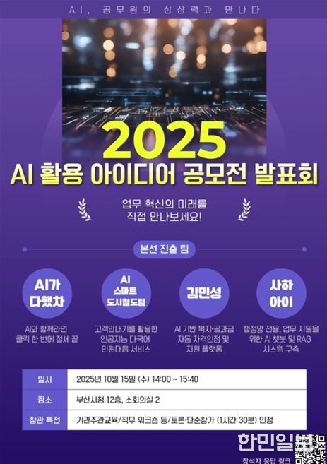 한민일보 서울포커스 임광현 기자 | 부산시는 오늘(15일) 오후 2시, 시청 12층 소회의실2에서 '2025년 에이아이(AI) 활용 아이디어 공모전 발표회'를 개최한다고 밝혔다.