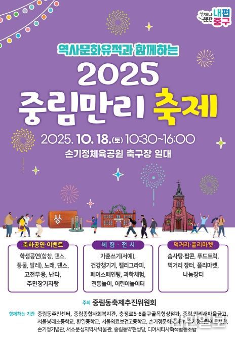 한민일보 서울포커스 김서윤 기자 | 서울 중구는 중림동 손기정체육공원 축구장 일대에서 오는 18일(토) 오전10시부터 오후6시까지‘2025 중림만리 축제’가 열린다고 밝혔다.