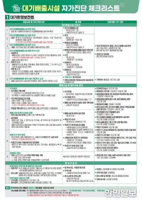 이번에 배포된 점검표는 사업장이 스스로 오염물질 배출시설 및 방지시설 운영 전반을 점검할 수 있도록 구성됐으며 배출시설 허가·신고 사항, 자가측정 이행 여부, 방지시설 정상 가동, 측정기기 부착·운영 상태, 환경기술인 선임 및 교육 이수 여부 등 12개 주요 항목과 세부 점검 사항이 담겨 있다.