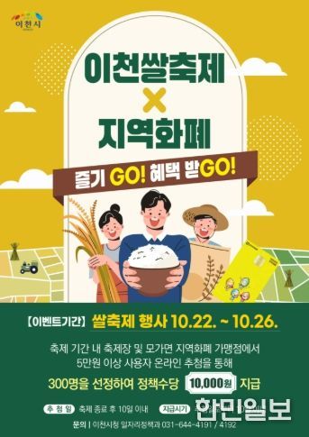 한민일보 서울포커스 박용남 기자 | 이천시는 2025 이천쌀문화축제 기간에 지역화폐 이용을 촉진하고 지역경제를 활성화하기 위해 코나아이(주)의 경기지역화폐 사회공헌 재원을 활용하여 ‘이천쌀축제, 지역화폐로 즐기고(GO), 혜택받고(GO)’ 이벤트를 추진한다고 밝혔다.