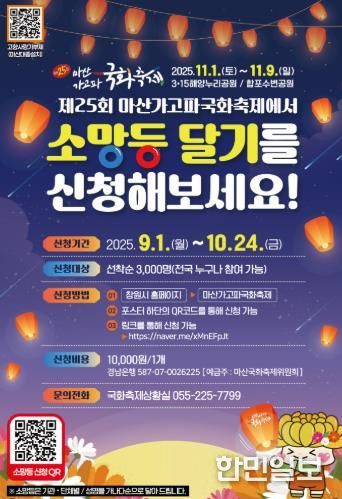 한민일보 서울포커스 김서윤 기자 | 창원특례시는 제25회 마산가고파국화축제의 시민 참여 프로그램인 ‘소망등 달기’ 신청기간을 당초 10월 17일에서 10월 24일까지 1주일 연장한다고 밝혔다.