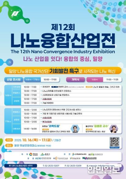한민일보 서울포커스 임철현 기자 | 경상남도는 오는 16일부터 17일까지 이틀간 밀양햇살문화캠퍼스에서 ‘나노산업을 잇다! 융합의 중심, 밀양’을 주제로 제12회 나노융합산업전(나노피아 2025)을 개최한다고 밝혔다.