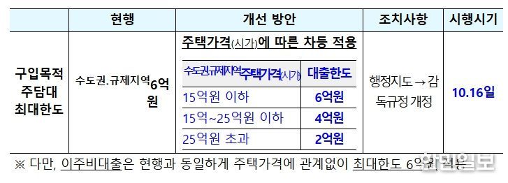 수도권·규제지역에 적용되는 주택구입목적 주담대의 대출한도(現 6억원)를 주택가격(시가) 수준에 따라 차등 적용한다. 수도권 · 규제지역의 ➊시가 15억원 이하 주택의 주담대 한도는 현행과 동일한 6억원, ➋시가 15억원 초과~25억원 이하 주택은 4억원, ➌시가 25억원 초과 주택은 2억원으로 대출한도를 차등 적용한다. 이를 통해 수도권·규제지역 내에서 대출을 활용한 고가주택 구입 수요를 보다 강력하게 관리해 나갈 예정이다.