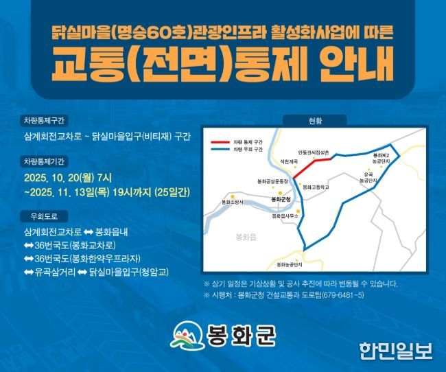 통제 구간은 삼계회전교차로 ↔ 닭실마을 입구(비티재)이며, 교통통제 기간 동안 삼계회전교차로 ⇄ 봉화읍내 ⇄ 36번국도(봉화교차로) ⇄ 36번국도(봉화한약우프라자) ⇄ 유곡삼거리 ⇄ 닭실마을입구(청암교)구간을 우회도로로 이용해야 한다. (지도사진 참조)