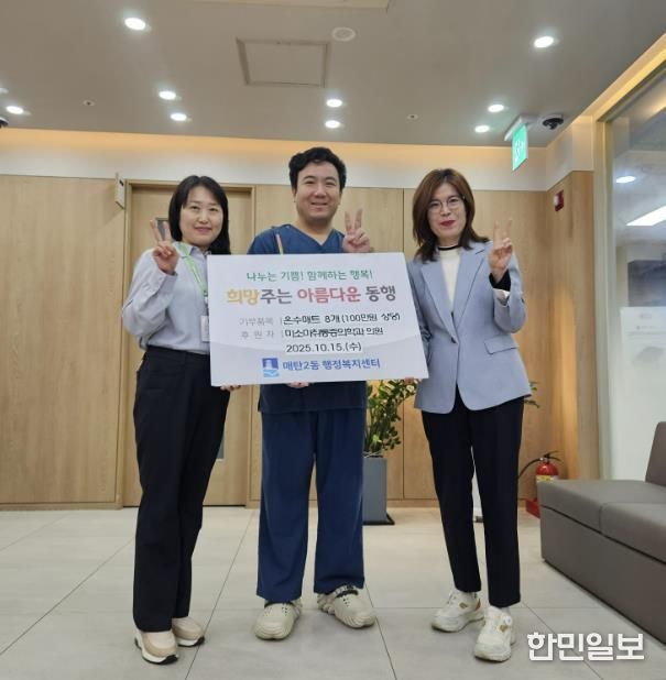 한민일보 서울포커스 진광성 기자 | 지난 15일, 수원시 영통구 소재 미소마취통증의학과의원은 관내 저소득 어르신들이 따뜻한 겨울을 보낼 수 있도록 매탄2동 행정복지센터에 100만원 상당의 온수매트 8세트를 기부했다.