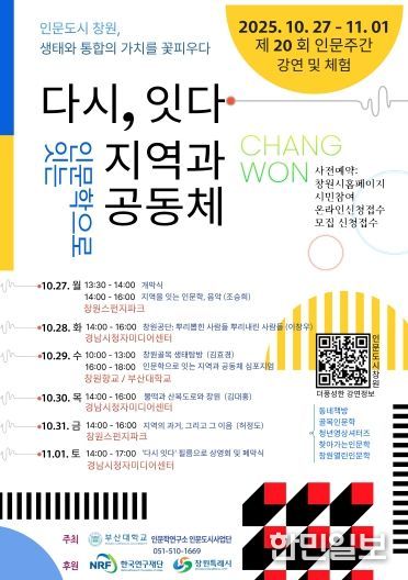 한민일보 서울포커스 김서윤 기자 | 창원특례시는 제20회 인문주간을 맞아 ‘다시, 잇다 – 인문학으로 잇는 지역과 공동체’라는 주제로 오는 10월 27일부터 11월 1일까지 창원스펀지파크, 경남시청자미디어센터, 창원향교 일대에서 인문주간 행사를 개최한다.