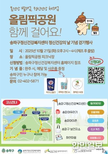 한민일보 서울포커스 박정민 기자 | 완연한 가을을 맞아, 서울 송파구가 오는 21일 오후 2시 올림픽공원 일대에서 정신건강의 날 기념 걷기 행사 ‘몸건강 벌크업, 정신건강 체크업’을 개최한다고 알렸다.